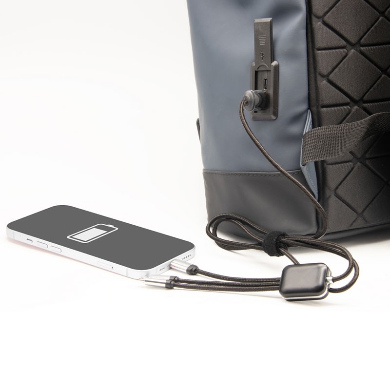Ce modèle offre une structure infroissable et un fond rembourré pour protéger efficacement vos affaires. Un compartiment matelassé permet d’y loger un ordinateur ou une tablette. Son système de charge intégré (connecteurs USB-A, USB-C et adaptateur micro USB) permet, avec un powerbank (non inclus), de recharger vos appareils en mobilité. Fermeture sécurisée par mousqueton en métal et zips imperméables.