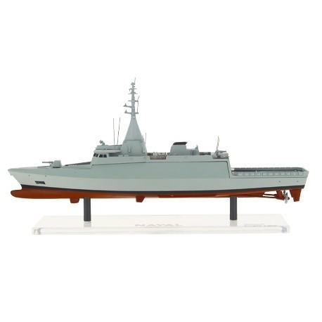 This 1/500 scale model of the Gowind surface ship is mainly made of metal and ABS. The fine finish is due in part to the finesse and precision of the details. The model is presented on an acrylic plate, and is packaged in an attractive individual box. No assembly is required. This product is not a toy,